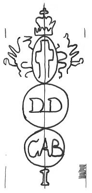 DescripciónEscudo de Génova sobre dos círculos con iniciales. Al pie un número.