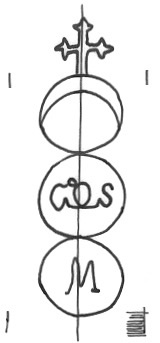 DescripciónTres círculos surmontados por una cruz. En el 1º una media luna, 2º monograma, 3º inicial.