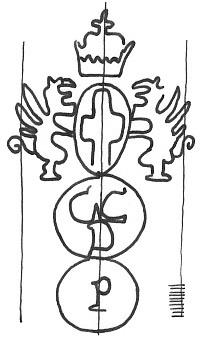 DescripciónEscudo de Génova sobre dos círculos con iniciales.