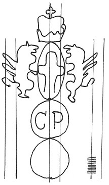DescripciónEscudo de Génova sobre dos círculos. 1º con iniciales.