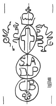 DescripciónEscudo de Génova sobre dos círculos. 1º con iniciales.2º iniciales sobre una flor.