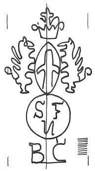 DescripciónEscudo de Génova sobre un círculo con iniciales. Al pie iniciales.