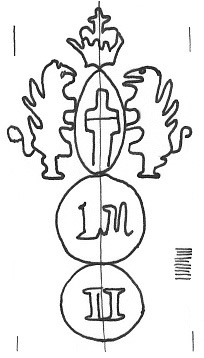 DescripciónEscudo de Génova sobre dos círculos. 1º iniciales. 2º un número.