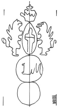 DescripciónEscudo de Génova sobre dos círculos. 1º iniciales.