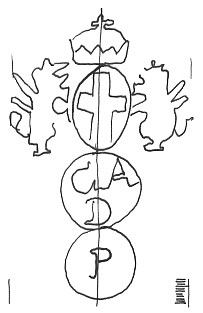 DescripciónEscudo de Génova sobre dos círculos con iniciales.