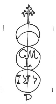 DescripciónTres círculos surmontados por una cruz. En el 1º una media luna, 2º y 3º iniciales. Al pie signo.