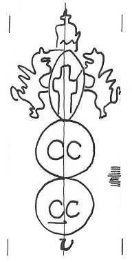 DescripciónEscudo de Génova sobre dos círculos con iniciales. Al pie un signo.