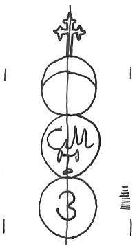 DescripciónTres círculos surmontados por una cruz. En el 1º una media luna, 2º iniciales, 3º número.