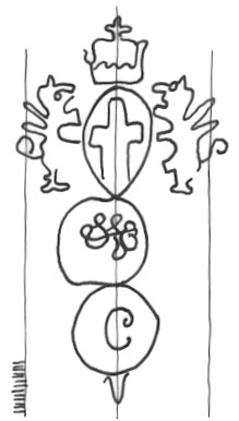 DescripciónEscudo de Génova sobre dos círculos. 1º emblema de María. 2º inicial. Al pie inicial.