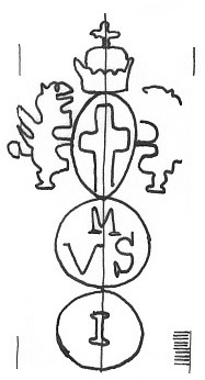 DescripciónEscudo de Génova sobre dos círculos. 1º iniciales. 2º número.
