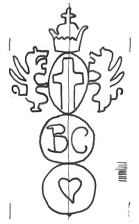 DescripciónEscudo de Génova sobre dos círculos. 1º con iniciales. 2º un corazón.