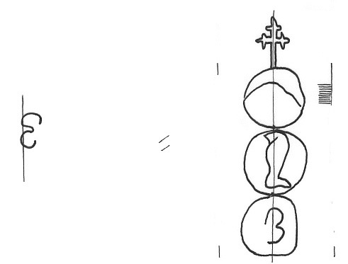 DescripciónUn círculo surmontado por una cruz. En el 1º una media luna, 2º una pierna. 3º inicial. Izquierda inicial