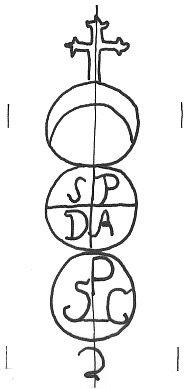DescripciónUn círculo surmontado por una cruz. En el 1º una media luna, 2º iniciales, 3º monograma.Al pie signo.