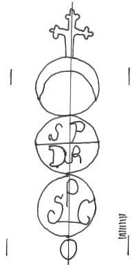 DescripciónTres círculos surmontados por una cruz. En el 1º una media luna, 2º iniciales, 3º monograma.Al pie inicial.