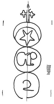 DescripciónTres círculos surmontados por una cruz. En el 1º una media luna sobre una estrella, 2º iniciales 3º número.