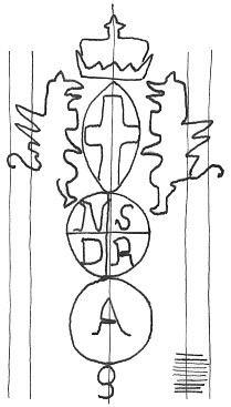 DescripciónEscudo de Génova sobre dos círculos. 1º con iniciales. 2º inicial. Al pie inicial.