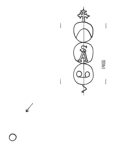 DescripciónTres círculos surmontados por una cruz. En el 1º una media luna, 2ª iniciales y 3º letras. En la base a la izquierda letra.