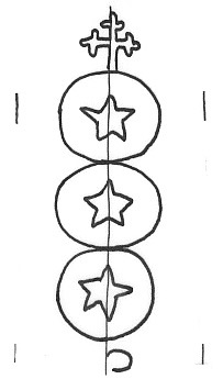 DescripciónTres círculos surmontados por una cruz. En el 1º, 2º y 3º una estrella. Al pie signo.