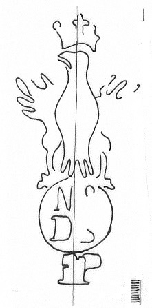 DescripciónÁguila coronada sobre un círculo con iniciales y al pie iniciales.