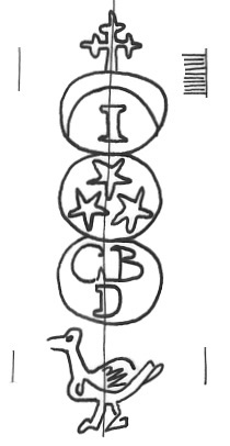 DescripciónTres círculos surmontados por una cruz. En el 1º una media luna y número, 2ª tres estrellas, 3º iniciales.Al pìe un pato.