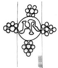 DescripciónUn círculo con grupos de circulitos, en centro monograma del fabricante.
