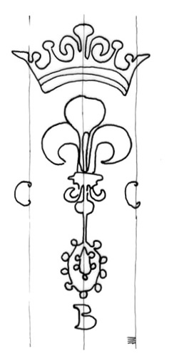 DescripciónLis coronada con iniciales en laterales y al pie.