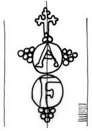 DescripciónDos círculos una iniciales dentro cada uno, con grupos de circulitos en el exterior y surmontado por una cruz.