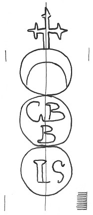 DescripciónTres círculos surmontados por una cruz. En el 1º una media luna, 2ª y 3º iniciales.
