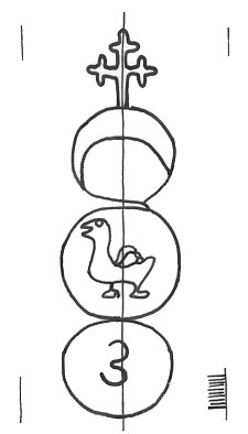 DescripciónTres círculos surmontados por una cruz. En el 1º una media luna, 2º Un pato, 3º número.