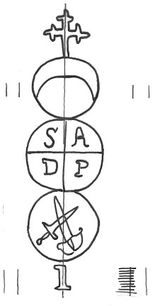 DescripciónTres círculos surmontados por una cruz. En el 1º una media luna, 2º iniciales, 3º dos espadas cruzadas. Al pie número.