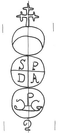 DescripciónTres círculos surmontados por una cruz. En el 1º una media luna, 2º iniciales, 3º monograma. Al pie número.