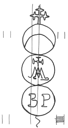 DescripciónTres círculos surmontados por una cruz. En el 1º una media luna, 2º cruz sobre monograma 3º iniciales. Al pie signo.