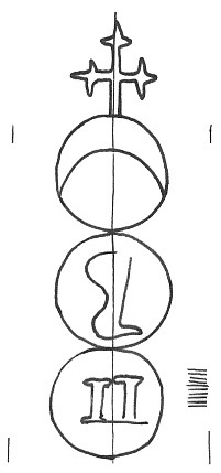 DescripciónTres círculos surmontados por una cruz. En el 1º una media luna, 2º una pierna. 3º número.