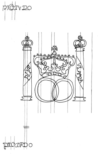 Las Colunnas de Hercules con el lema Plus Ultra rodeando dos dobles círculos surmontados por una corona. Arriba y abajo a la derecha apellido del fabricante.