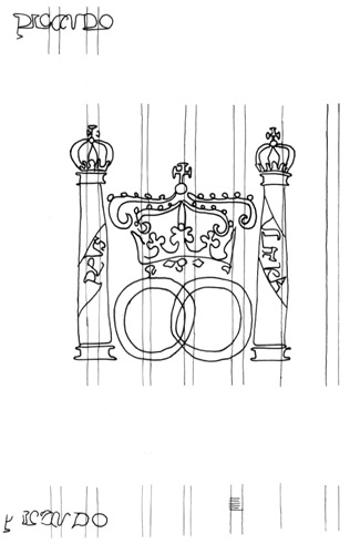 Las Colunnas de Hercules con el lema Plus Ultra rodeando dos dobles círculos surmontados por una corona. Arriba y abajo a la izquierda apellido del fabricante.