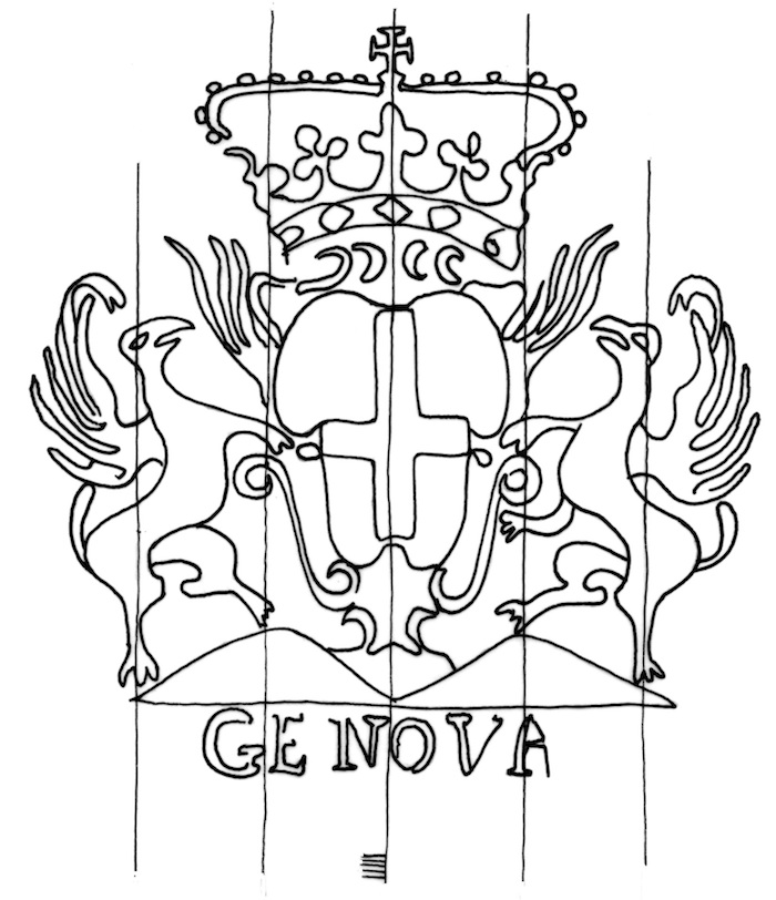 DescripciónEscudo de Génova. Al pie Topónimo.