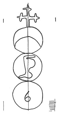 DescripciónTres círculos surmontados por una cruz. En el 1º una media luna, 2º una pierna. 3º número.