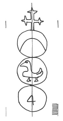 DescripciónTres círculos surmontados por una cruz. En el 1º una media luna, 2º Un pato, 3º número.