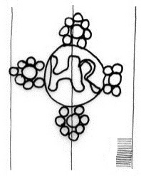 DescripciónUn círculo con grupos de circulitos, en centro monograma del fabricante.