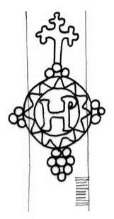 DescripciónDoble círculo con línea interior en zig-zag con monograma del fabricante en el centro, surmontado por una cruz.