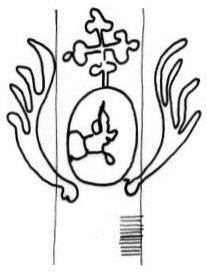DescripciónEscudo alado surmontado por una cruz trebolada, en el campo una mano con un puñal.
