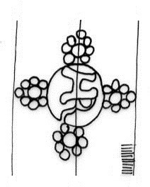 DescripciónUn círculo con grupos de circulitos, en centro monograma vertical del fabricante.