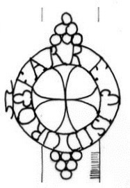Doble círculo con el nombre y apellido del fabricante y una flor de cuatro pétalos dentro y un grupo de circulitos en la parte superior e inferior del circulo.