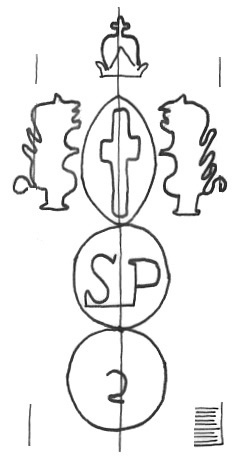 DescripciónEscudo de Génova sobre dos círculos. 1º iniciales. 2º número.