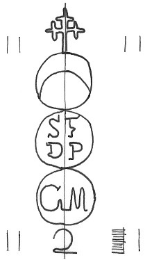 DescripciónTres círculos surmontados por una cruz. En el 1º una media luna, 2º y 3º iniciales. Al pie número.