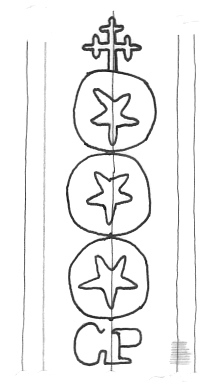 DescripciónTres círculos surmontados por una cruz. En el 1º, 2º y 3º una estrella. Al pie iniciales.