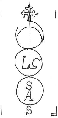 DescripciónTres círculos surmontados por una cruz. En el 1º una media luna, 2ª y 3º iniciales, al pie una inicial.