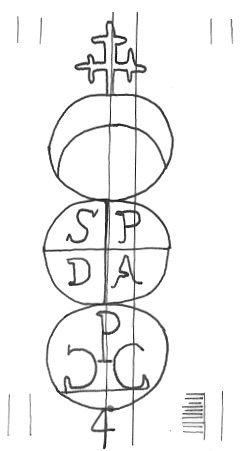 DescripciónTres círculos surmontados por una cruz. En el 1º una media luna, 2º iniciales, 3º monograma.Al pie número.