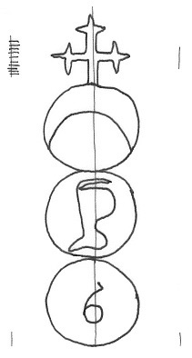 DescripciónTres círculos surmontados por una cruz. En el 1º una media luna, 2º una pierna. 3º número.