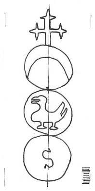 DescripciónTres círculos surmontados por una cruz. En el 1º una media luna, 2º Un pato 3º inicial.